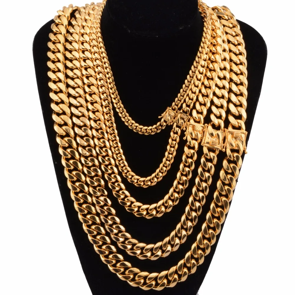 ORIGINAL 8/10/12/14/16/18mm Yellow Gold Color Stainless Steel Cut Curb Cuban Chain Men's Necklace Jewelry 18