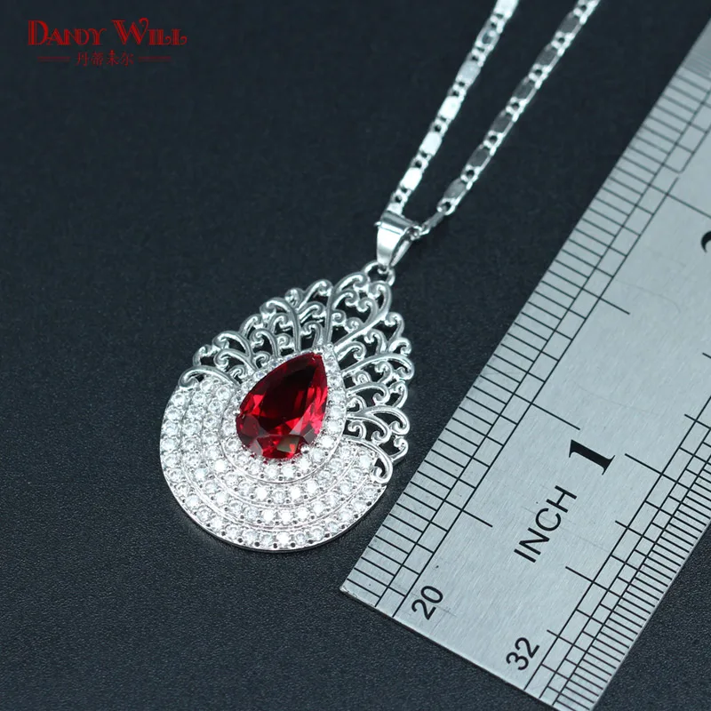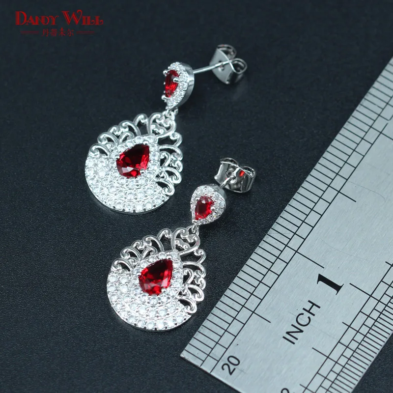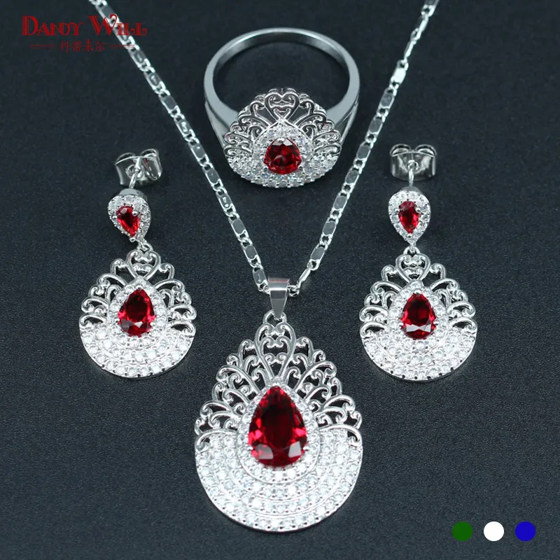 Red Crystal White Zircon Silver Color 925 logo Bridal Jewelry Sets For Women Necklace/Earrings/Ring